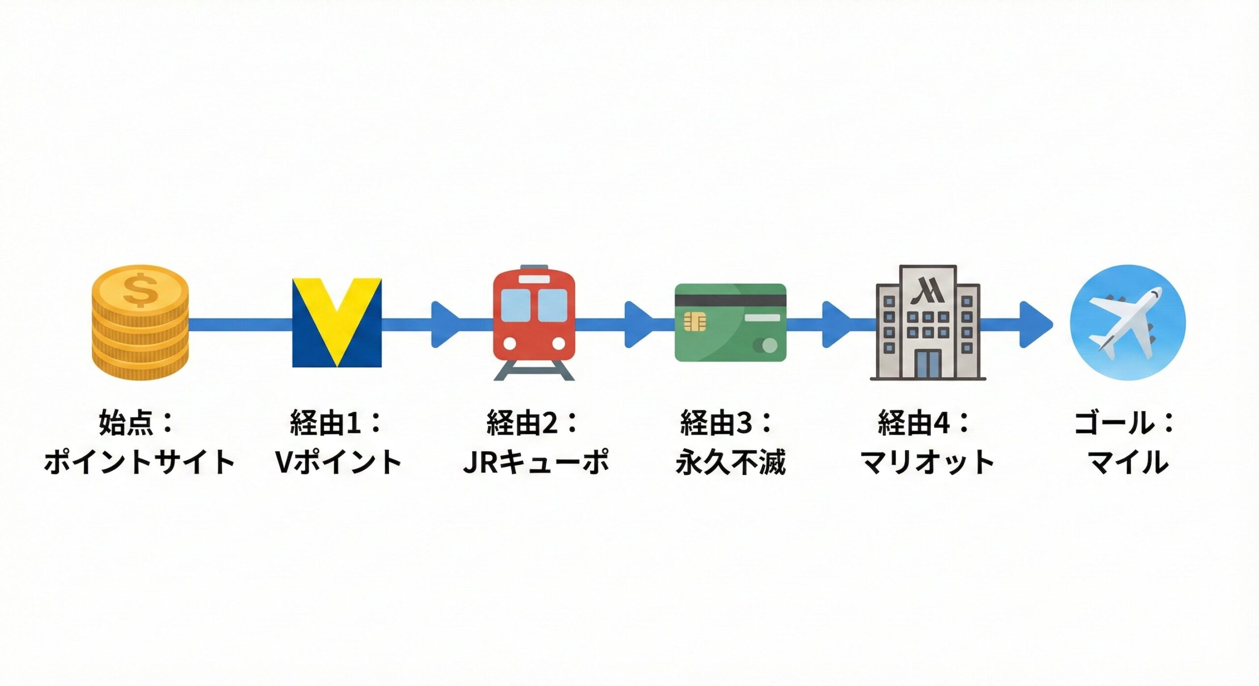このルートを通すことで、日本のドメスティックなポイントが、世界中どこでも使える「ハードカレンシー(Marriottポイント)」に生まれ変わります。特にMarriottからUAへの移行はボーナスが付くため、還元率はさらに向上します。